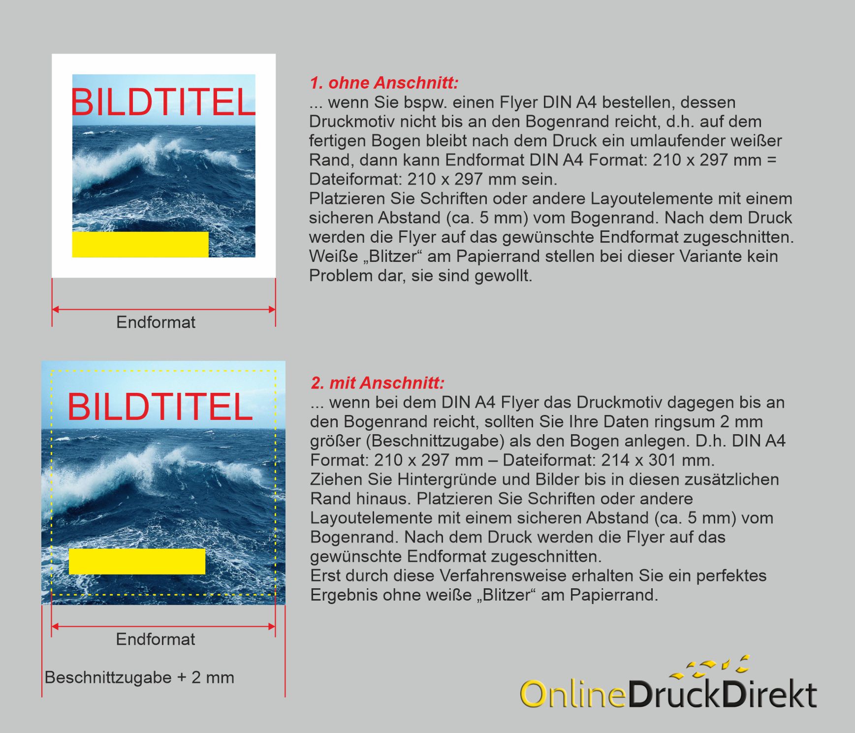 - Umlaufend 2 mm Beschnittzugabe einhalten, bei Plakaten 5 mm