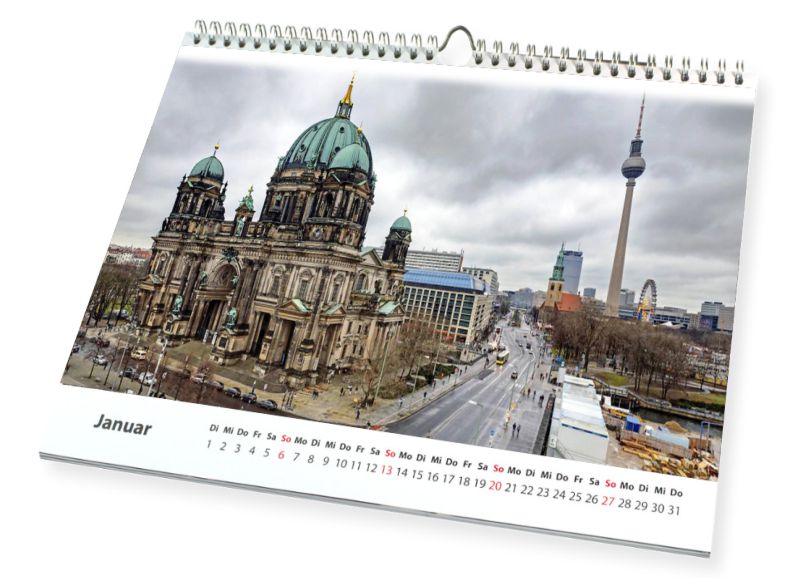 Der Kalender kann mit einem Titelblatt, mit einer Deckfolie oder als pures Kalendarium gefertigt werden. Der Druck kann sowohl farbig oder in Schwarz-Weiß ausgeführt werden. Als Rückkarton wird ein neutraler Karton eingebunden.